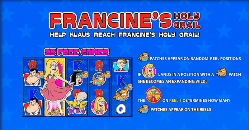Next, we have Francine’s Holy Grail feature where sets of Klaus icons appear at random. When Francine herself hits the reels during this round next to Klaus symbols, she will turn into the expanding wild and cover the entire reel. Up to 25 free rotations are also added.