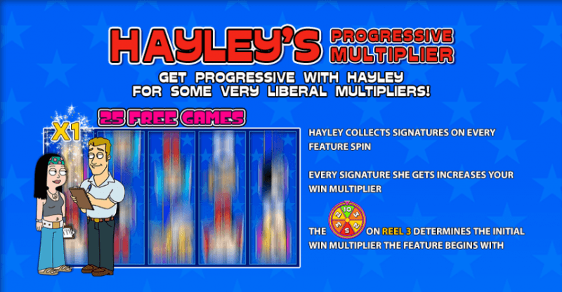 If you’re lucky, you’ll get Hayley’s progressive multiplier bonus where she will collect signatures. The more she gets – the higher your win multiplier will be. Each signature adds x1 multiplier. And lastly, the Wheels and the Legman feature shows Steve and Roger chasing each other leaving a trail of wilds on reels. Also, 25 free rolls are awarded.