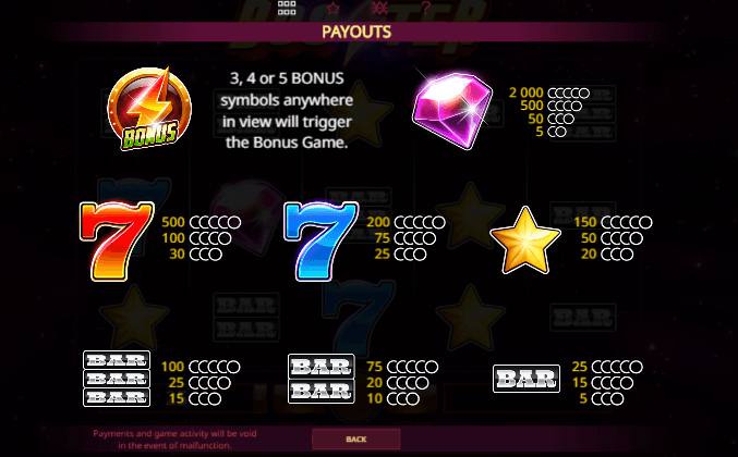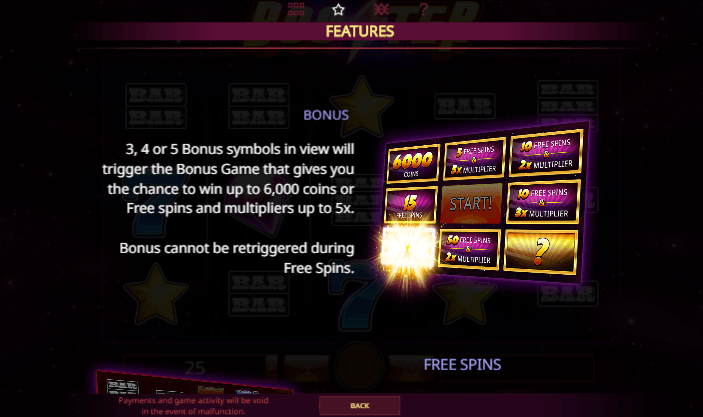 The reels are full of pictograms that are frequently used in fruit machines with the classic theme. Therefore, you can create a winning combination of five diamonds and win 2,000 coins. This precious gemstone is the highest paid icon. In addition to that, you can win from 200 to 500 coins for the five-of-a-kind combination of blue or red 7s. If you collect five golden stars you can win 150 credits, while single, double or triple bars pay the maximum of 25, 75 or 100 coins respectively.
