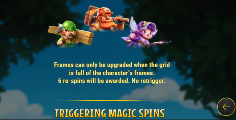 Magic Wood Wonders borrows clever ideas from Buildin’ More Bucks — especially the concept of upgrading materials — but with a fantasy twist. Instead of wood, brick, and gold frames, you cultivate sapling, oak, and ancient magic frames that bloom across the reels and deliver bigger rewards: