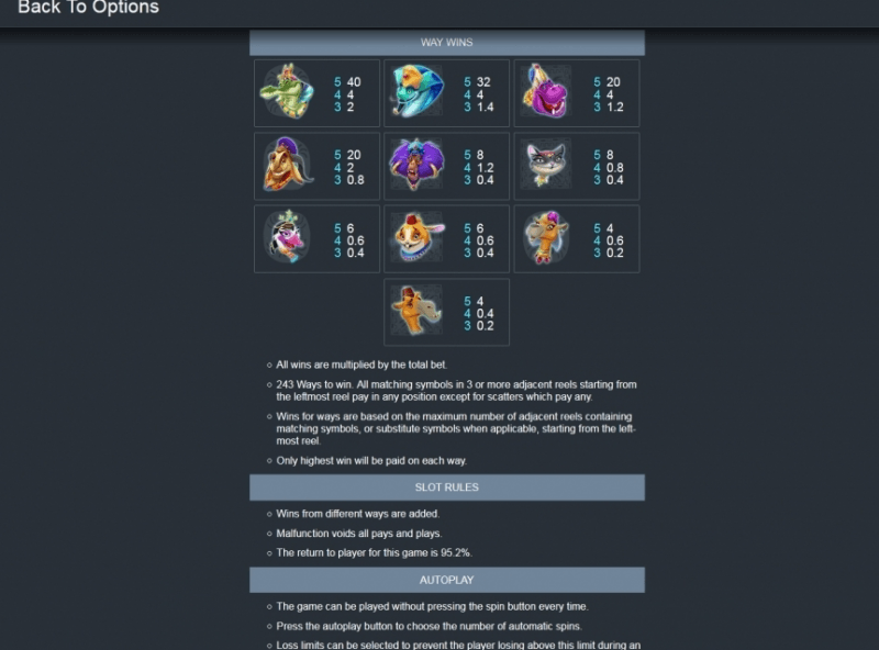 The layout is very traditional to many of Eyecon’s creations and provides 243 ways to win on the grid of five reels and three rows. The bet starts at 0.25 credits and can reach up to 50. The theoretic return to player is 95.2%. Up to 100 automatic rotations are available.