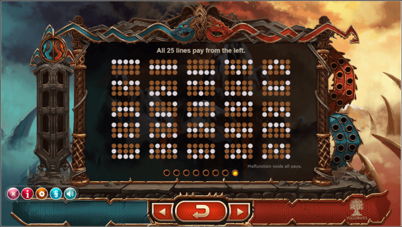 The background of the reeled machine is set within a beautiful Asian landscape divided between light and dark to represent the two mighty dragons found in the game. On the left-hand side, you will see that the setting is in dark blue, giving a chilling feeling as this represents the Ice Dragon’s habitat. Opposite, you will notice a warmer and lighter feeling with snow-capped mountains far on the horizon. This is the home to the Fire Dragon.