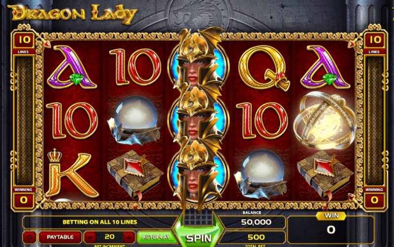 Dragon Lady has five reels, three rows, and ten paylines. You can set a betting range from as low as 0.01 to the maximum of 2.00 per line. You can wager one coin per line. The return to player is 96%. Continue reading to find all about paying symbols and bonus games.