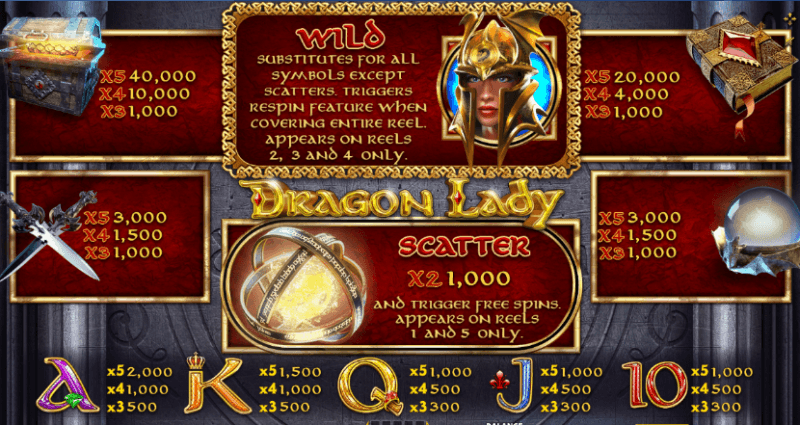 - Dragon in the guise of a young virgin or the brave beauty in the golden helmet with the wings of a dragon acts as Wild. It will appear only on the second, third, fourth reels, and it replaces other icons, except the Scatters. It can occupy the whole reel allowing you to enter the free re-spin program. The reel with the Wild Dragon Lady freezes, the rest continue to rotate creating new winning combinations.
