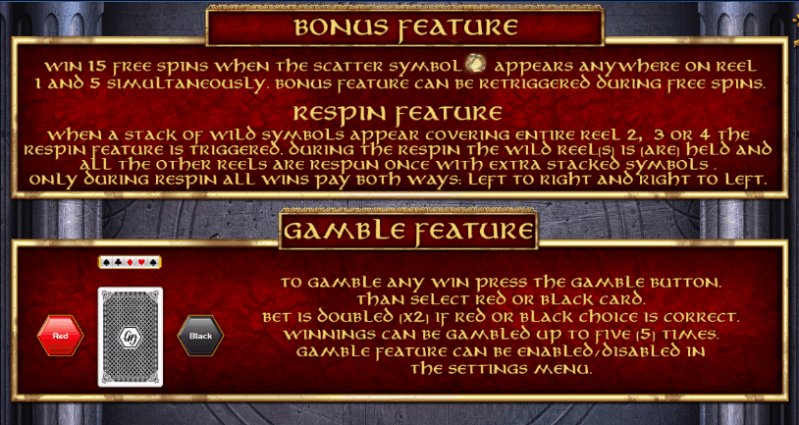 You can also win fifteen bonus spins when the Scatter symbol appears anywhere on reel one and five at the same time. Additional Wild stacks are added to the reels during this round. The bonus feature can be retriggered during bonus spins.