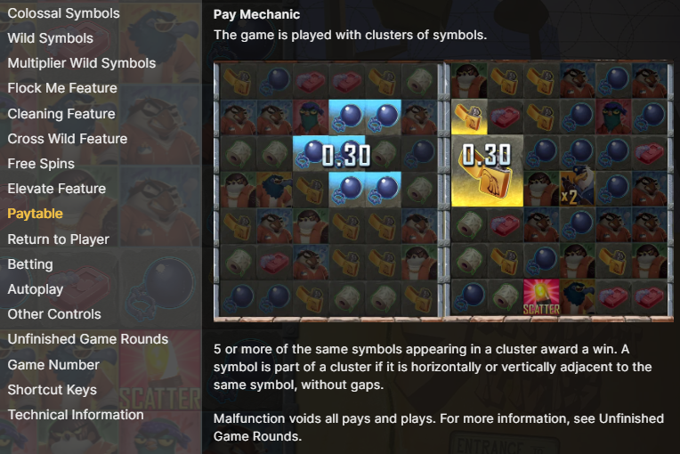 Bird-Beat Behind Bars reimagines the Flock Me concept with creativity, humor, and intense gameplay. Its combination of cluster mechanics, avalanches, roaming multiplier wilds, colossal symbols, and sticky free-spin features makes it exciting from start to finish. The bold theme adds flavor and personality, while the high win potential keeps players engaged and hopeful.