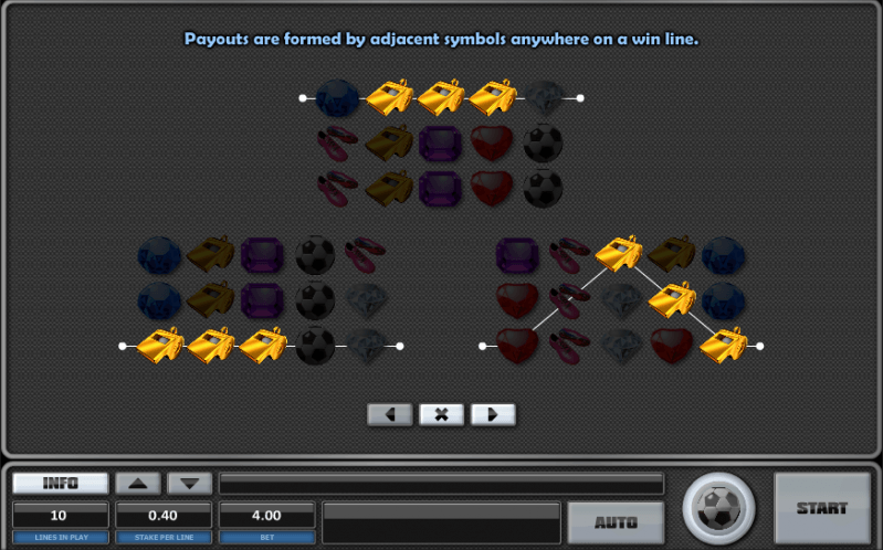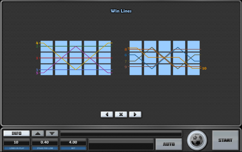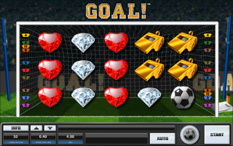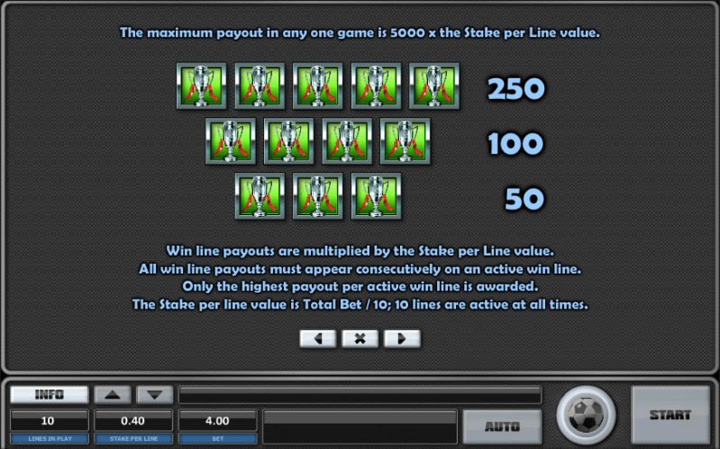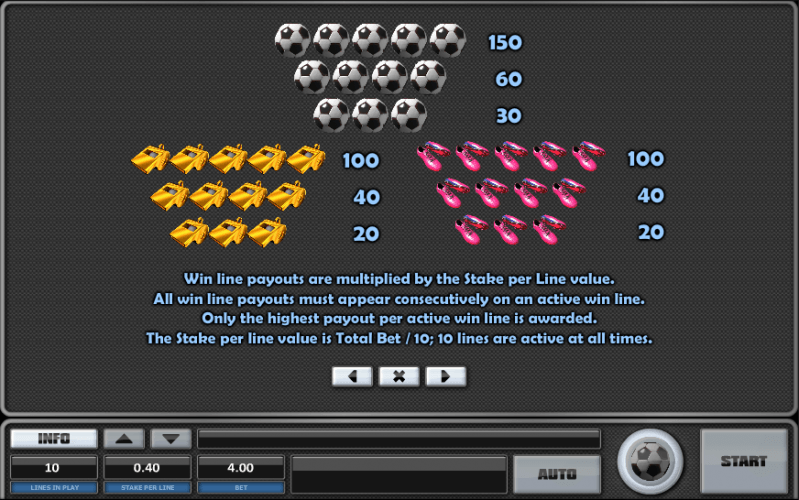 The football theme is immediately obvious with the background featuring a moving advertising hoarding and a blurred image of fans behind the goal. The reels are set out inside a goal net and whenever you press ‘start’ they spin to the accompaniment of upbeat electronic music. There is a lively atmosphere and whenever you hit a win, the ref’s whistle blows to signal your ‘goal’.