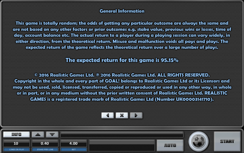 Goal! has five reels and ten paylines. These are fixed to give the maximum number of ways to win with every spin. You can alter your bet by clicking the plus and minus buttons to select your stake per line from 0.01 to 10.00 each spin. This means your minimum bet is 0.20 and your maximum bet is 100. The maximum payout in any one game is 5000x. The return to player is 95.15%.