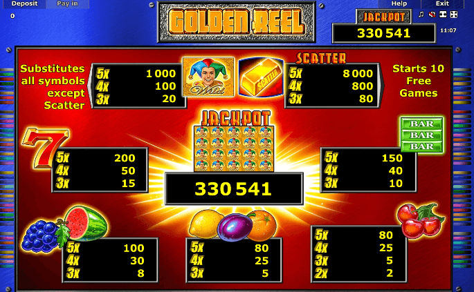 Are you tired of modern online slot machines with too many complicated features to get used to? On the hunt for basic gameplay that can boost your bankroll with stacks of cash without staking the earth per spin? If you have answered yes to both of those questions, then the Golden Reel slot machine from Novomatic is perfect for you. It offers classic gameplay with a few modern features thrown in for a good measure. The reels of the game are slightly different from what you are probably used to, as symbols can appear stacked for bigger winning combinations plus the reels are 4 symbols high. On your journey, you will come across Wilds, Scatters, Bonus Spins and a progressive jackpot that grows and grows until some lucky devil scoops the lot – the more you stake, the more you can win. Continue reading our full review below to learn everything about this reeled machine.
