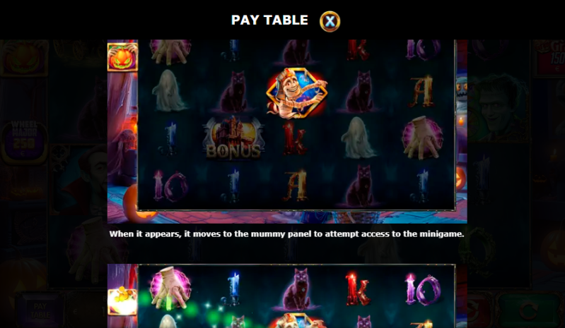 - Mummy Symbol + Halloween Ghosts X minigame — land a mummy in any position and activate the Ghosts multiplier minigame. Each mummy multiplies the prize value of ghost symbols found in its place. Land more mummies, and the multipliers stack.
