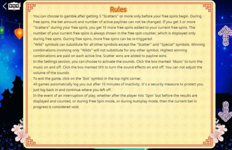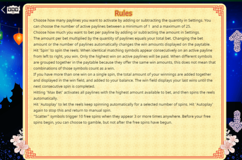 This title takes us on a romantic journey to the land of pagodas and lanterns. This walk to remember is shared with a couple of main characters, and among other icons are traditional dragon masks, rabbits, as well as card icons from King to seven.