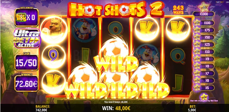 Located in a sunny glade, Hot Shots 2 uses a straightforward and popular grid set up of 5 reels, 3 rows with 243 win ways. A patch of land has been cleared for the football pitch with the grid located smack dab in the middle. This time around, the reels are not transparent but are still surrounded by a crowd that celebrates the wins and lets out a disappointing ‘ooh’ sound when the scatters don’t quite hit. A jolly tune plays throughout, and the overall vibe is a fun and cheerful one.