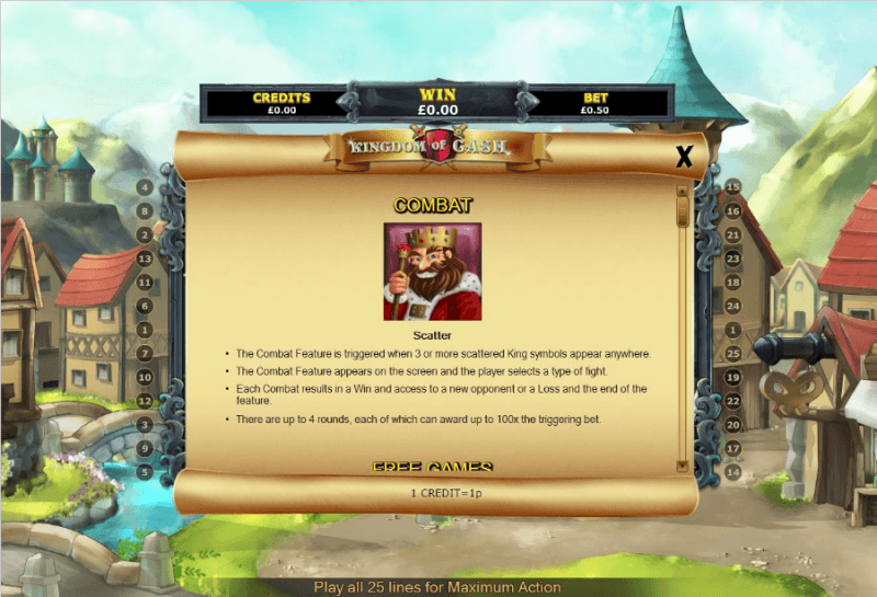 This reeled machine has several interesting features. Thus, Combat Feature is triggered by landing three or more King Scatters anywhere on the screen. A new screen will appear, and you will have to select a type of fight. If you win, there is a prize of up to 100x your total bet. You have four possible fights to win but a loss will end the round.