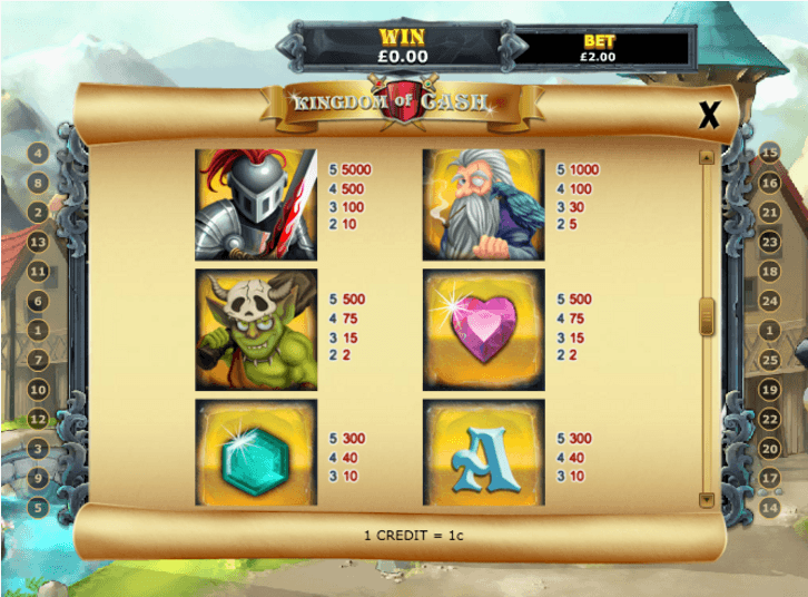 The paytable of Kingdom of Cash is a blend of classic and original reel symbols, related to the medieval theme of the game.