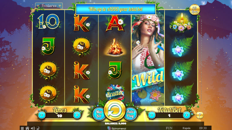 Kupala is a new slot machine by Spinomenal that is inspired by Slavic culture and its folklore. This time, the studio tells a thrilling legend about the celebration of Kulapa Night. Magic, entertainment, and mythical fern flowers are those elements that make the slot enjoyable. An unusual plot is combined with high payouts, Scattered wins, and frequent winning combinations are created with the help of Wilds.