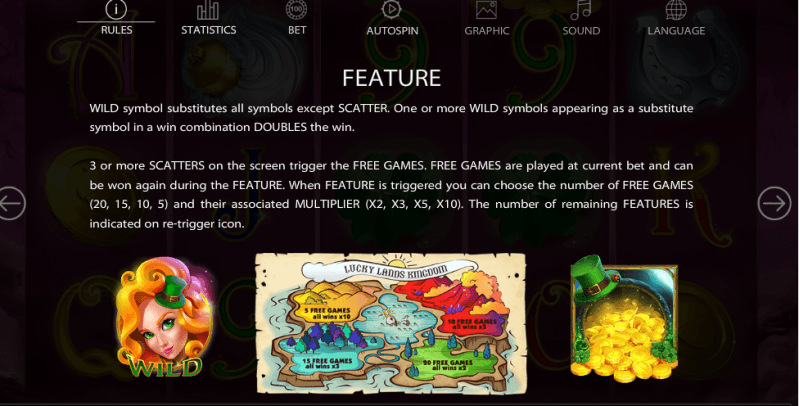 Three or more pots of gold, left on the reels by leprechauns, award the bonus round. Users have a chance to choose how many free spins they want to play. It can be 5, 10, 15 or 20 rotations with respective multipliers of 2x, 3x, 5x or 10x.