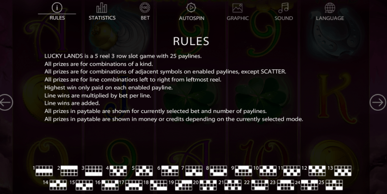 The reviewed slot is devoted to one more popular theme. It represents the fairy side of Irish culture, its beliefs about luck and fortune, and allows little leprechauns do the magic on the reels that have the configuration of 5x3. They are crossed by 25 paylines that give lucrative payouts if a winning combination lands on them. The controls on the screen will hint you that a stake of anywhere between 1 and 10 credits per spin should be placed to start playing. Leprechauns can also make the reels spin faster and automatically if you press the respective buttons on the panel. The release has the RTP of 96%.