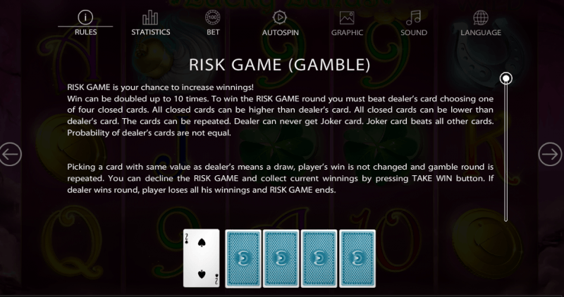 Every time a win is awarded, venturous leprechauns offer you to try your fortune and try to double it in a gamble round. You must pick one out of four cards. If it beats the dealer’s card, your payout is increased.