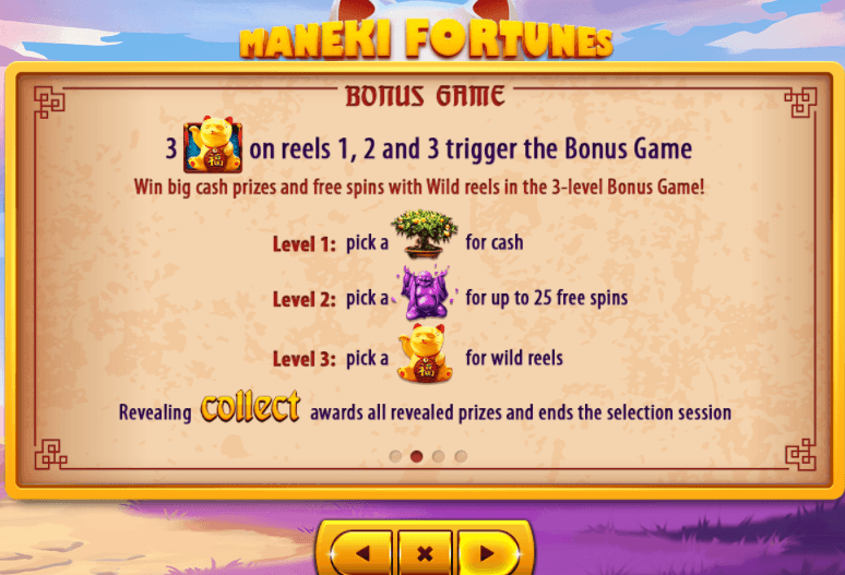 The bonus game is triggered when three Lucky Cats are spun which then reveals three additional levels.