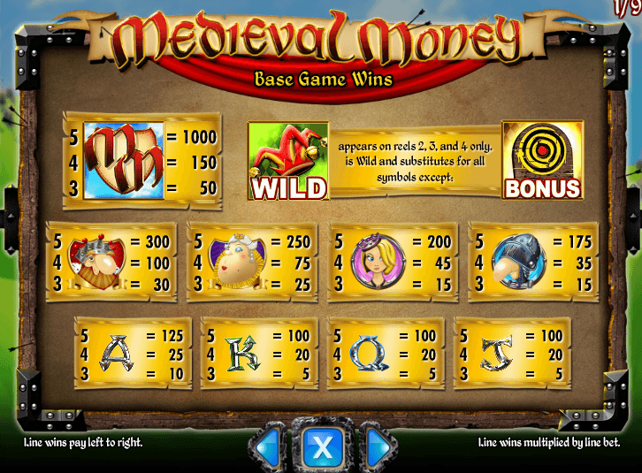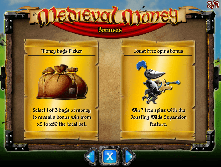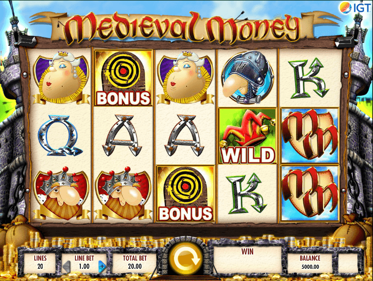 Discover the epoch of romances, knights, and chivalrous code with the Medieval Money slot developed by IGT slots. This game will show you the bright side of life in the Middle Ages with tournaments, charming ladies, and bags full of money. Being one of IGT games, this slot appeals to players due to its fairytale-styled symbols, a variety of bonus games, and an impressive advertised jackpot of 2,500,000 coins.