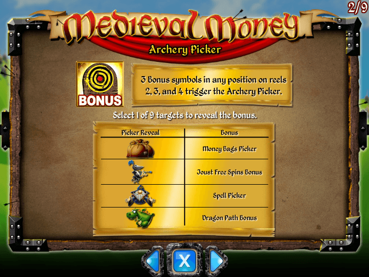 There is a Bonus symbol, represented by the target. It appears on reels 2, 3, and 4 and triggers the Archery Picker Bonus game. You are to select one target out of 9 to reveal which of the bonuses (Money Bag Picker, Joust Free Spins, Spell Picker, or Dragon Path) you are going to play:
