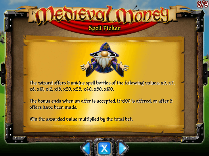 Spell Picker: The tricky wizard will offer you five bottles with different spells, which are worth from x5 to x100 multiplier. The bonus round is ended once you accept the order, the x100 spell is found, or the magician makes all five offers.