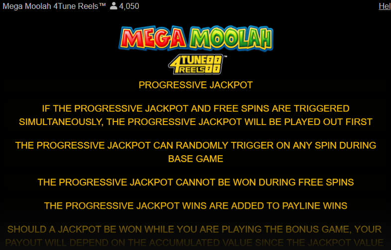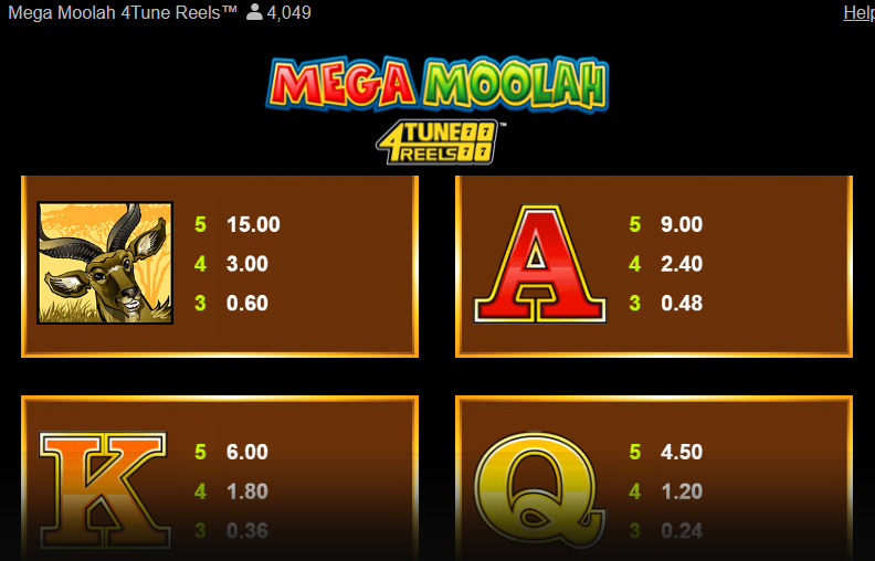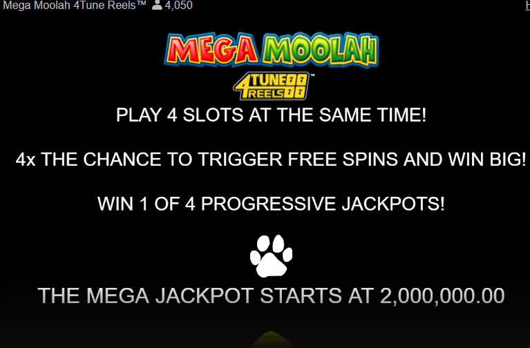 As for the maximum win in the Mega Moolah 4Tune Reels slot, it is slightly over 650x the total bet. However, this is the prize that can be scooped on one separate set of reels. If you are fortunate enough to have maximum rewards on all for gameplay, the grand prize will increase significantly. The volatility is obviously quite low, as 4 sets of reels multiply your chances for a win by four times!