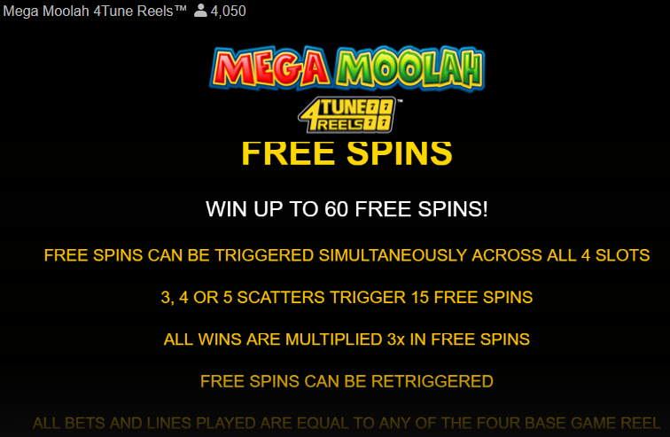 We have seen this mechanics several times from Blueprint Gaming, but it is Games Global that has decided to give slots with four sets of reels another chance. That is exactly what you can find in its recent Mega Moolah 4Tune Reels online slot. A cherry on top is the dynamic gameplay is the progressive Mega Moolah jackpot that can be scooped at any moment. Having 4 sets of reels might be confusing, so we will walk you through all the features and characteristics of this innovation, explain how it works, and what potential wins it can bring! Furthermore, links to the best casinos are included, so you can play Mega Moolah 4Tune Reels right after reading our review below!Mega Moolah 4Tune Reels Slot Machine Review [Up to 60 Bonus Spins with x3 Multiplier]