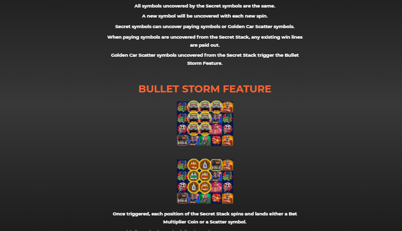 Triggered by landing three Free Spin scatters, this round delivers 10 free spins. It guarantees a Mission at the start and introduces progressive Wanted Levels, meaning multipliers climb as you continue.