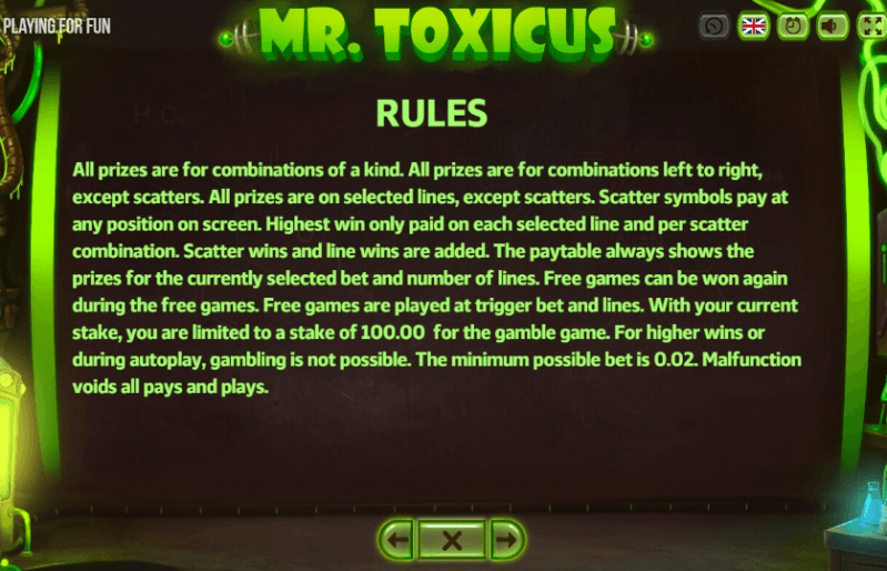 Mr. Toxicus slot machine by Fugaso sets action in a secret lab, where one mad scientist performs wild experiments in a search for a potion for good wins. This story is complemented with a range of useful features, including bonus spins and a special Expanding Icon. There is also a way to double any win. The Jackpot Series complements the action. Depending on the betting strategy, you can expect to get up to 125,000 coins! Follow the review below for more details, links to play and suggestions about games on a similar topic.