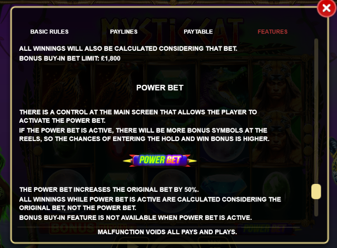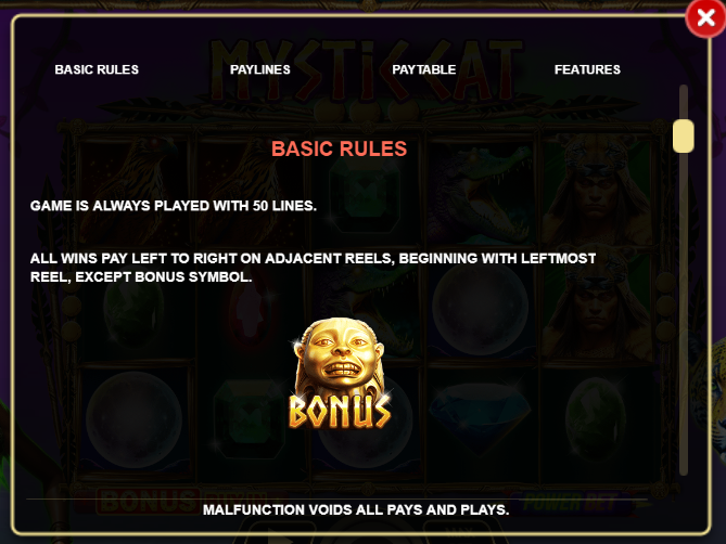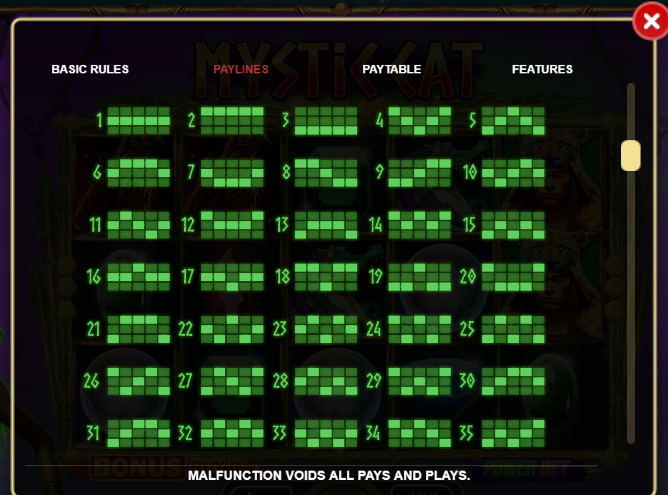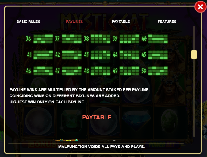 As for the grid configuration, it consists of five reels and three rows. The studio gives you 50 paylines to create winning combinations and scoop rewards. As the total bet ranges from 0.5 to 300 credits per spin, we would recommend the Mystic Cat slot to medium and high rollers.