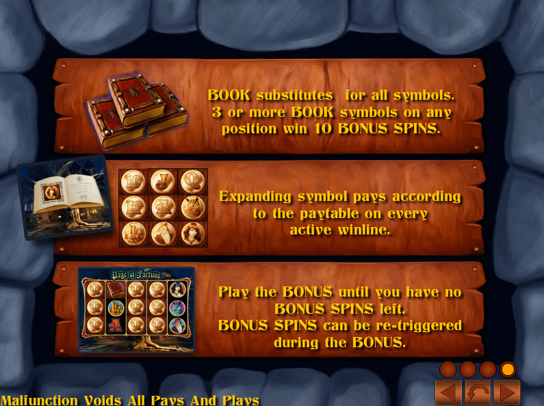Speaking of the unique Bonus Round, this is perhaps the biggest draw of Page of Fortune and is also incredibly easy to trigger. Read the book of spells and find the one, which helps you to win! Draw three, four, or five Scatters with the picture of the Magic Book on a single spin and play the Bonus Game. Before it begins, the Book will show you a random icon, which will become the Expanding symbol for the remaining ten Bonus Spins. The bonus feature can also be reactivated during bonus spins by finding three more Book symbols anywhere on the five reels, meaning you can essentially stay in Bonus Spin mode for quite some time.
