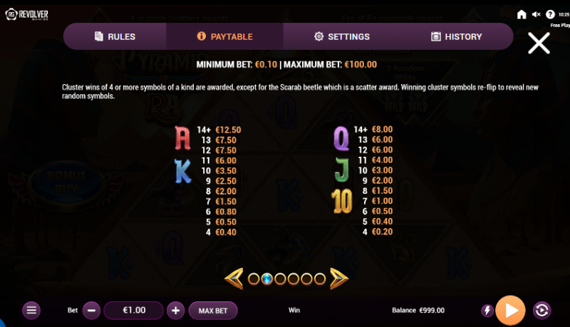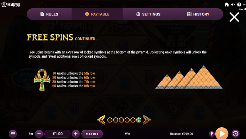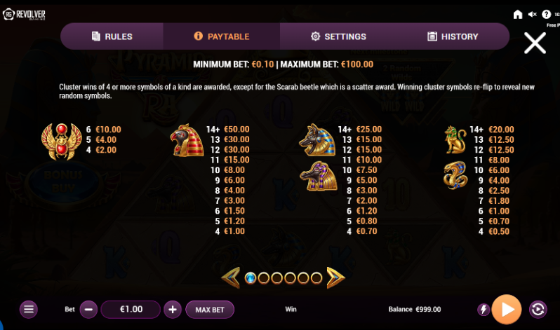 - Free Spins Feature (Scarabs and Ankhs): Landing enough scarab beetle symbols triggers a Free Games round. During these free spins, the pyramid can expand. Each free spin scatters Ankh symbols on the grid; collecting a set number of Ankhs adds a new row to the pyramid. This expands the triangular reel shape, giving more symbol positions and a higher chance for huge clusters. In fact, SlotCatalog notes that scarabs “trigger the Free Games feature with sacred scarab beetles, expanding the pyramid and unlocking epic riches.”. As players collect more Ankhs, the pyramid grows taller row by row, unlocking even more spin opportunities.