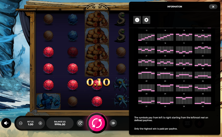 The grid itself becomes a mythic battleground, placed between towering tidal waves and swirling sandstorms. The atmosphere is heightened with orchestral music that swells like an ancient saga. When the Rival Reels activate, the clash of swords and storms echoes through the reels, pulling you further into this mythical confrontation.