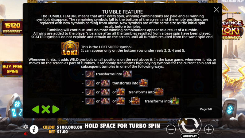 - Tumble Feature: With each victorious spin, the Tumble Feature triggers a cascade of symbols, clearing the path for new opportunities and greater rewards. Embrace the chaos as symbols vanish and new ones emerge, paving the way for untold riches to be claimed.