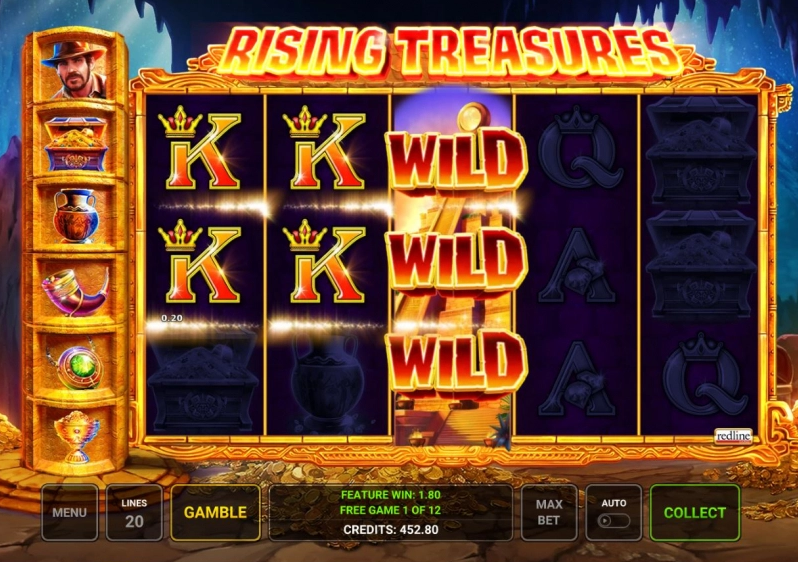 - The Rising Treasures slot provides exciting payouts at the five matching symbol levels. Payouts for three symbols are much lower and require the help of the expanding wilds and the bonus feature in order to clock-in better wins.