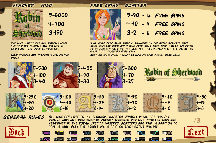 - The Scatter is the lovely Maid Marion. It is paid independently of its location at the screen and active lines. Three and more Scatters trigger six, nine or twelve Bonus Spins during which the casino pays the customer’s bet. All wins are doubled here. Also, you can scoop 90x, 10x, and 2x for getting five, four and three Scatters.