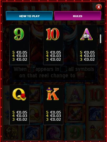 You can almost feel the ground vibrate as the stampeding herd of wild bulls drags you along on the wildest ride in the Rumble Rumble slot by Ainsworth Game Technology. This game has five reels which expanding, a hundred paylines, and Free Spins. Let our expert online gambling review guide you through the maze that the free Rumble Rumble video slot seems to be. Scroll down for more!
