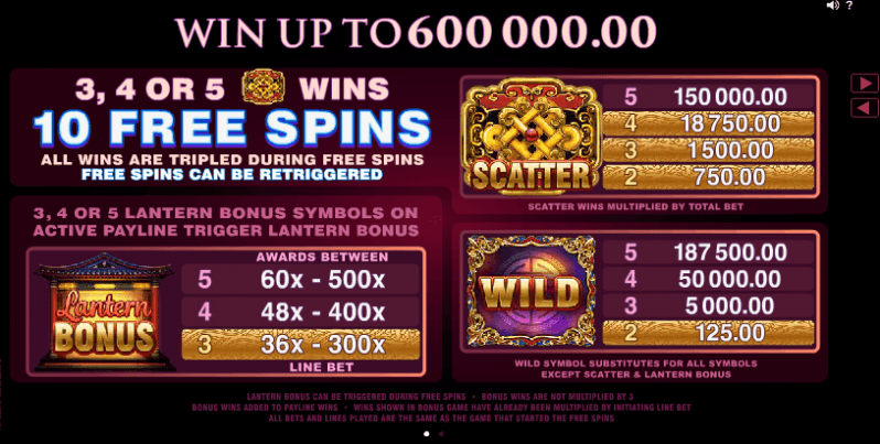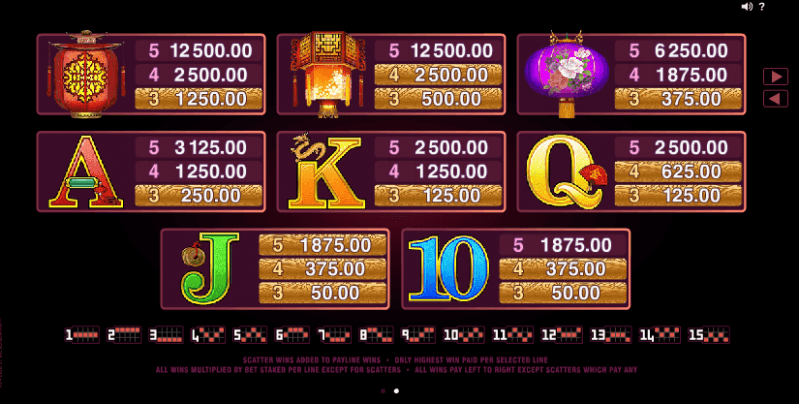 - The three other main game symbols are a trio of intricately designed and colorful Chinese lanterns, and these pay from 0.15 to 5.00 for a 0.15 stake.