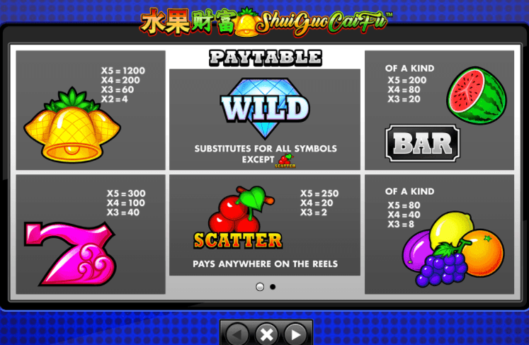 Shui Guo Cai Fu has cute Chinese symbols so it must be some kind of Oriental-themed slot, surely? You are waiting for pretty cherry blossoms, or fierce tigers, a bit of kung fu maybe. Even some sushi would probably do. Sadly, you are going to be disappointed. Shui Guo means fruit, while Cai Fu is riches or fortune. So, yeah, the theme is fruit.