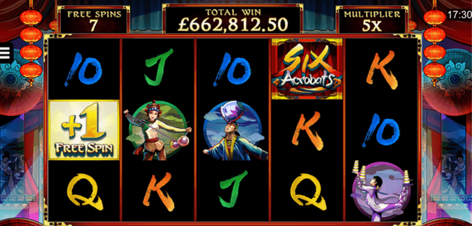 Six Acrobats is a brand-new spectacular slot machine from Microgaming. It transfers everyone to the thrilling Asian circus show with talented artists and engaging performances. The new game advertises a jackpot of 390,000 coins, bonus round, and free spins mode.
