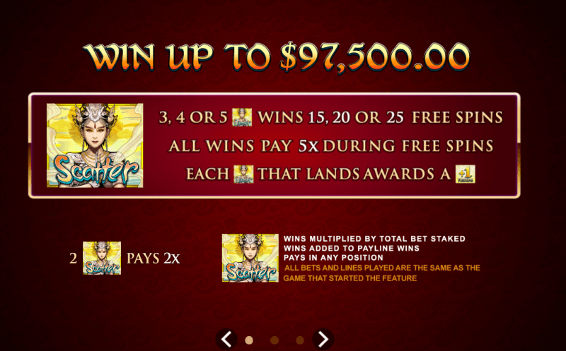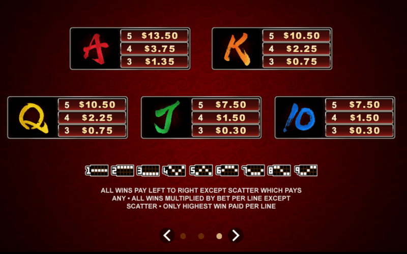 All symbols that reward high payouts are represented by five characters that are in the process of their performance on the stage. They give wins from left to right and pay from 500 to 3,750 coins for the five-of-a-kind combination. There are also poker pictograms, depicted in the style of Asian writing. These icons are worth anywhere between 125 to 225 credits for the five identical pictograms.