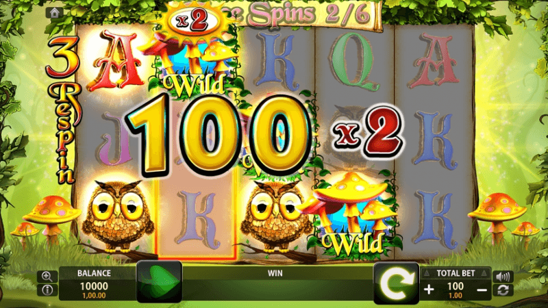 The base game has two lucrative features. One of them is random Expanding Wilds. The trees depicted on this special icon may decide to grow from time to time, covering all three vertical positions. Another Wild character of the forest, the mushrooms, can participate in re-spins. What is more, these tiny yet powerful creatures of the paytable can cause multipliers of the wins in re-spins up to x3.