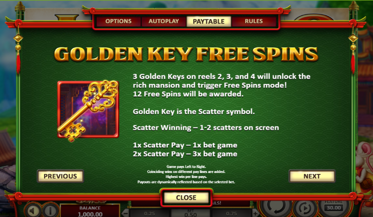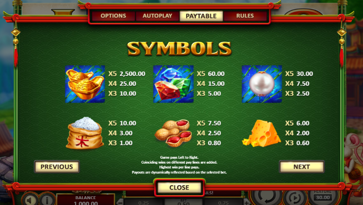 The reels are set in one of the secluded Chinese villages, and are filled with all sorts of goods - ancient coins, bags of rice, golden keys, peanuts, slices of cheese, pearls and gems. Looking over all this riches is the Lucky Rat - the symbol of the year 2020. Rest assured that in terms of animation, sound and music effects, the game is performed in accordance to the highest standards.