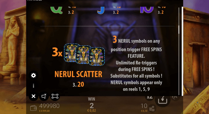 - Scattered Nerul pays up to 20x the total stake for its three-of-a-kind combination.
