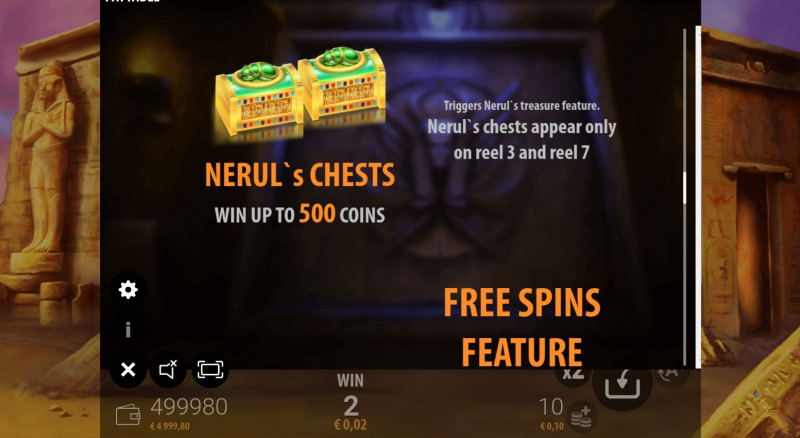 A set of two Nerul’s Chests landing on the third and seventh reels will unlock a feature where up to 500 coins can be won.