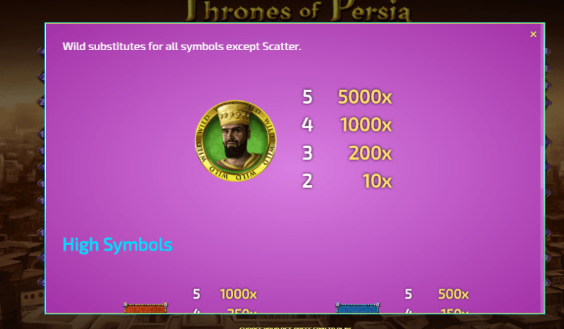 The Persian emperor is Wild and has enough power to substitute for other pictograms on the grid. In addition to that, he offers the highest payout in this machine that is equal to 5,000x the total bet;