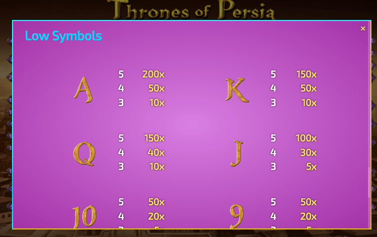 The Thrones of Persia slot has the grid with 5 reels and 3 symbol rows. Payouts are offered for winning combinations of three, four or five identical icons that appear on 20 paylines. The size of the reward depends on the size of the total stake that ranges from 0.40 to 100 coins per spin. There is also an opportunity to activate up to 100 automatic spins in this machine. The game is developed in HTML5 and can be played on all modern devices. The demo version is available here.